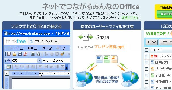 公開されているサービスは、文書作成の「ThinkFreeてがるワープロ」、表計算の「ThinkFree てがる表計算」、プレゼンシート作成の「ThinkFree てがるプレゼン」の3つだ。