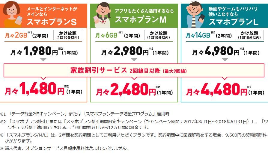 家族で契約すれば2回線目以降は500円割引が適用されるので、(302-500)で月額0円利用も可能に。見方を変えれば2回線で302円。1回線あたりで考えれば請求額151円ですね。こちらも12ヶ月限定割引なので以降は請求額アップに注意ですが、中々お得。
