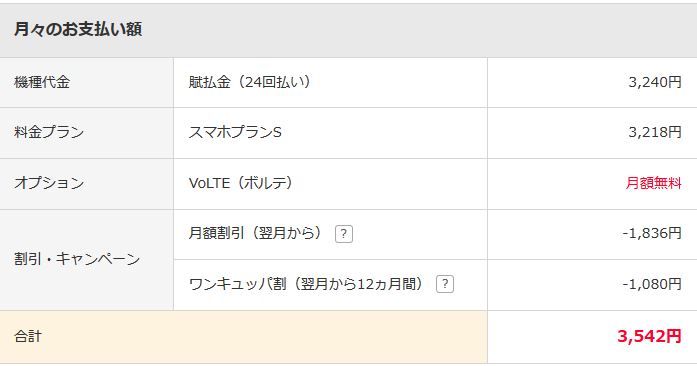 ちなみに32GBを選んだ場合は定価65,340円になり、これを一括で払うと毎月の請求額518円で利用可能になります。(32GB版は割引額が少し減るので518円になる仕組みです)