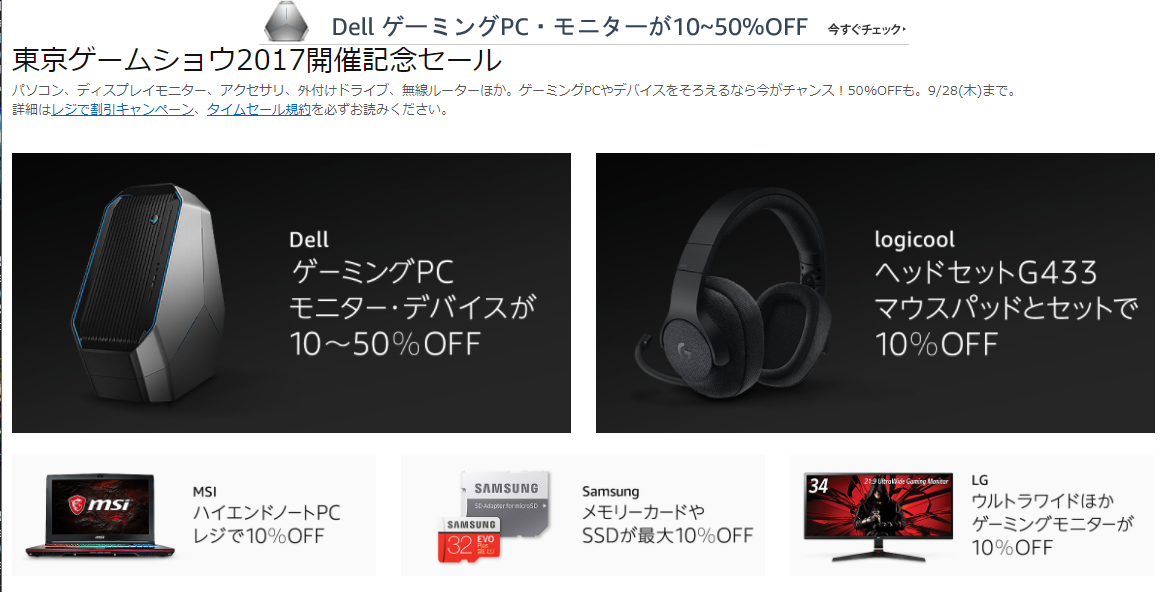 対象製品がゲーミングデバイスやモニター、パソコンと高価なものが多いにもかかわらず10~50%オフとおすすめです。