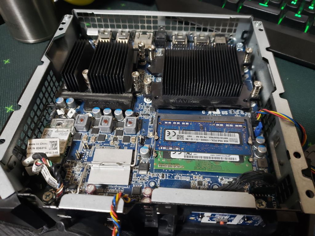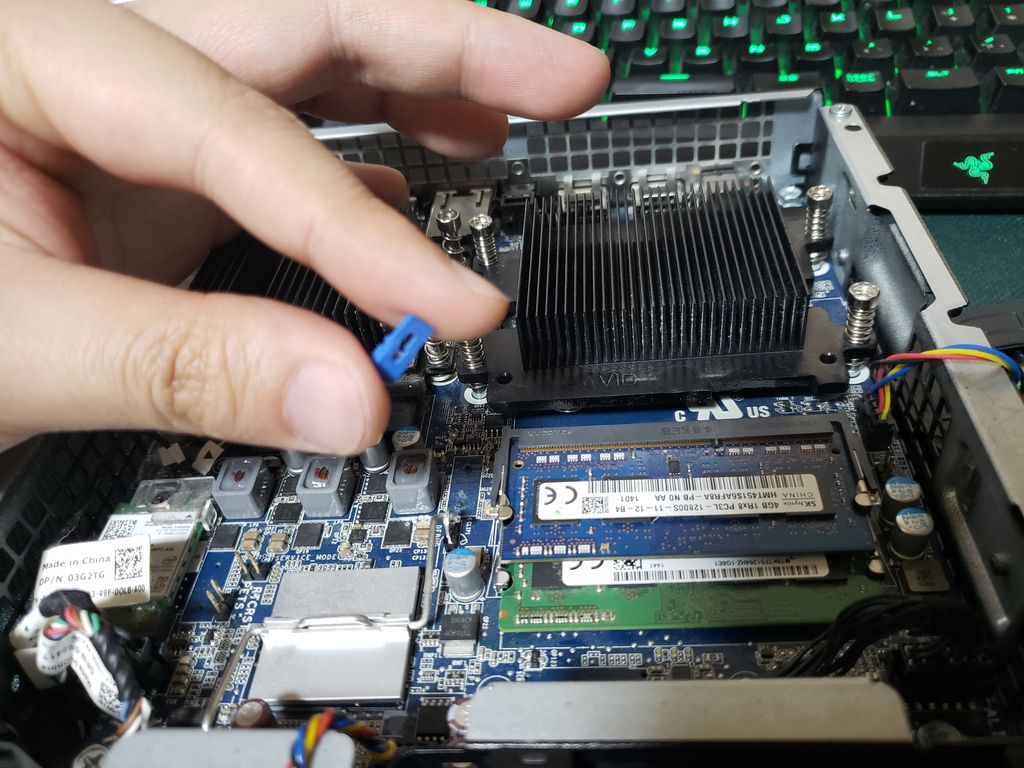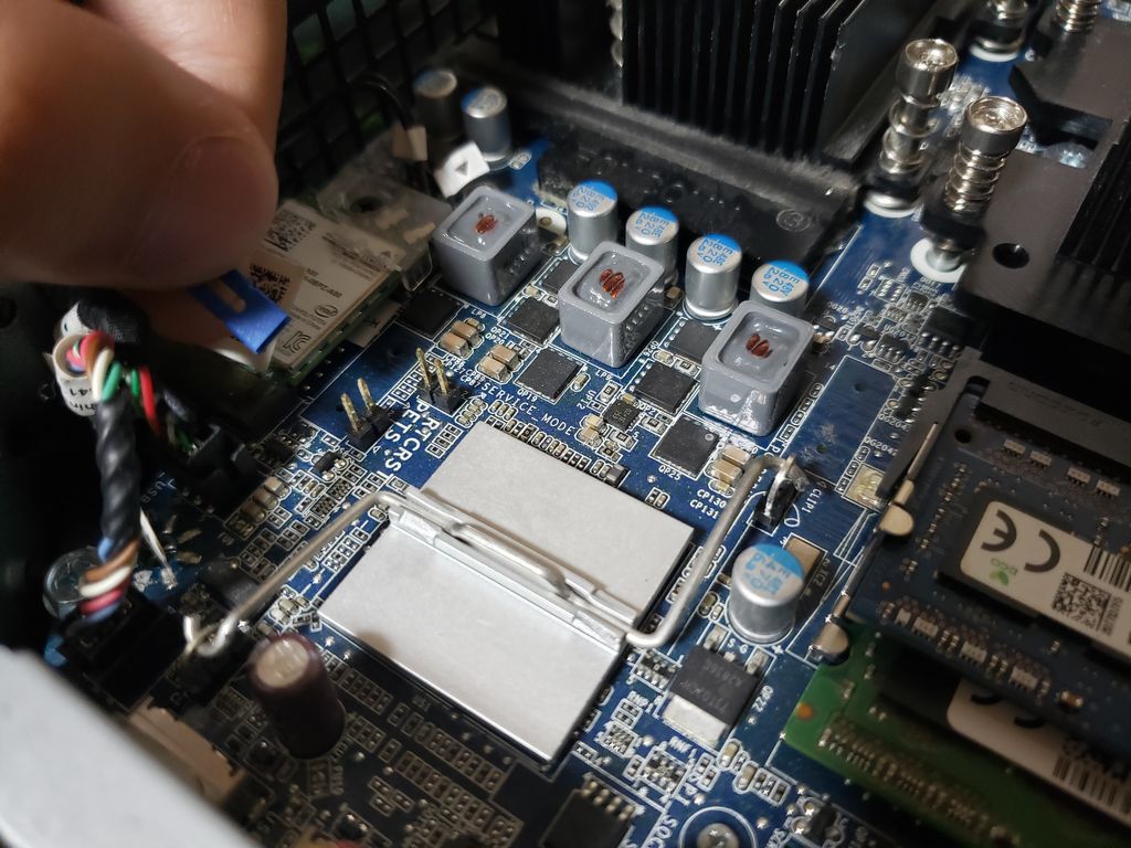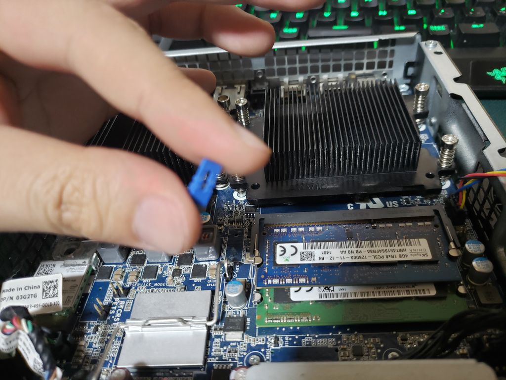 こやつを今度はメモリの左側にあるピンに差し込む。画像中央に2つあり悩みますが左の方にさします。しっかり差し込んだのを確認して数秒待ったら青ジャンパーを抜いてもとのメモリ右側のピンに戻し、ファンや殻も元通りにして再起動をかけます。
