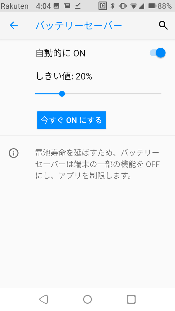 バッテリーセーバーの”自動的にON”をONに。バッテリーセーバーは処理性能が低下する代わりに電池消費を抑えることができます。カクツキやもたつきを感じるようになってしまうので、電池に余裕があるときは当然オフが推奨。%のところをいじることでバッテリーが一定値になったときにオートでONになるよう設定できます。私は20%にしましたがお好みで。