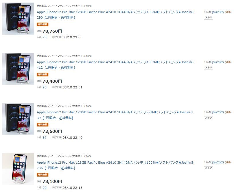 モデルや状態によって価格差が振れ幅は大きいが一例としてヤフーオークションに流れているiPhone12ProMaxのデモ機の落札相場を見てみよう。※2022/08時点でのiPhone12ProMax(市販モデル)の中古相場は11万円~13万円。
