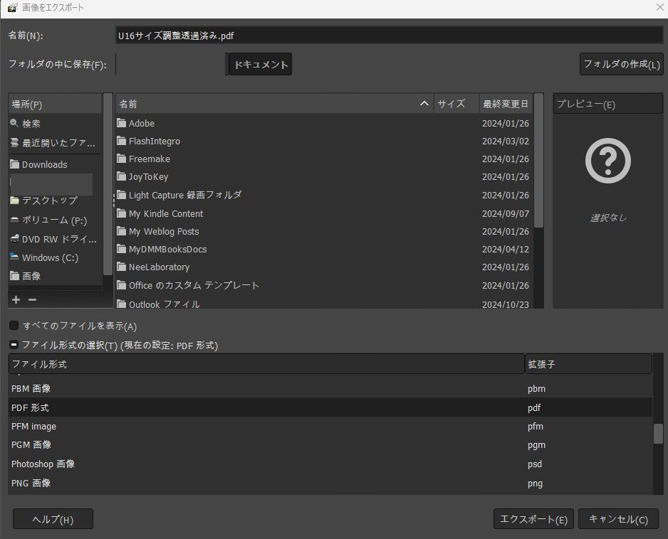 5.適当な名前をつけて下部にあるファイル形式の選択⇨PDF形式を選択して適当な場所にエクスポート(保存)して完成。