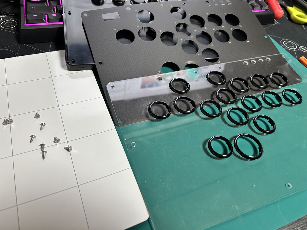 カッターで大枠と直線部分、サークルカッターでボタン、ネジ穴は4mmの穴あけパンチを持ってればそれで、なければカッターで頑張る。大枠部分はハサミでやってもいいかもしれません。