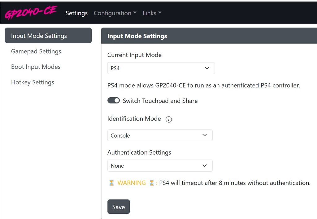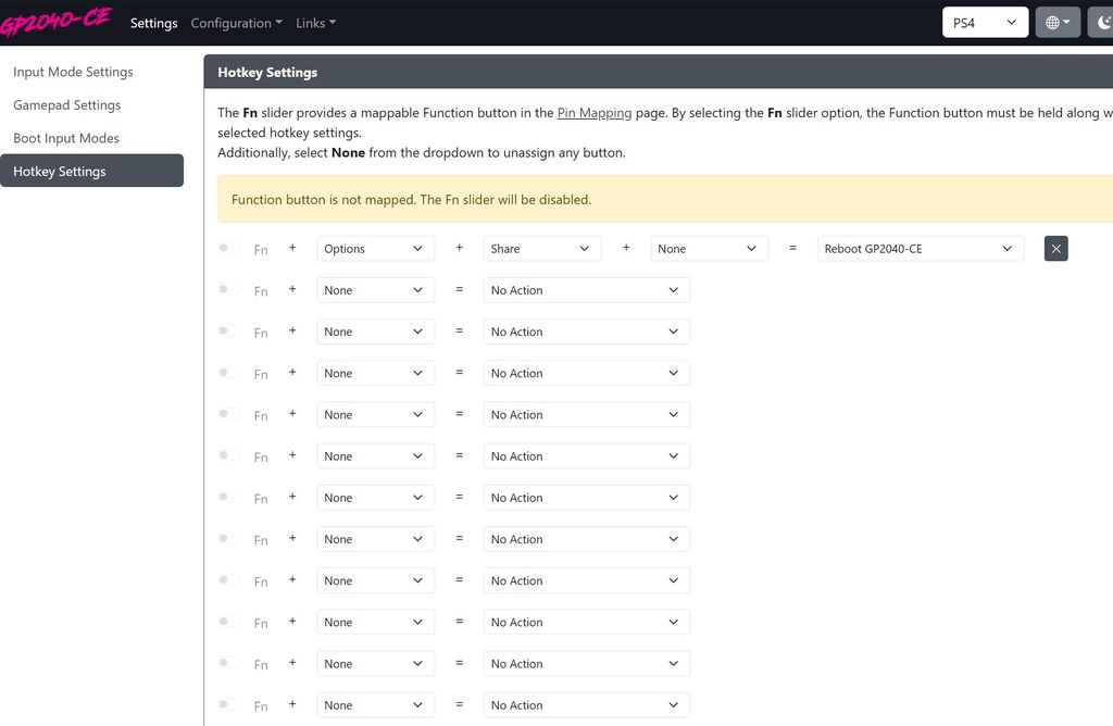 上記画像ではOptionとShareの同時押しでコントローラーの再起動をかけれるようにしてるがこれは好みでどうぞ。このホットキーを用意しておくとSTARTボタン押しながら抜き差しで設定モードに入るという手間から解放される(OptionとShareの同時押し再起動⇨Optionはそのまま押しっぱで設定モードに)