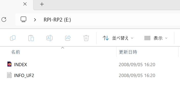 ここに「flash_nuke.uf2」をD&Dまたは切り取り⇛貼り付けする。自動で初期化が始まり10秒ほどまってると再度ドライブとして認識され上記画像と同じ画面が出てくる。