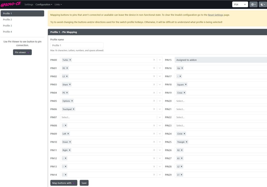 PIN00には連射設定用のターボボタンがあるので右側のバツを押して割り当てなしにしておくのが推奨。