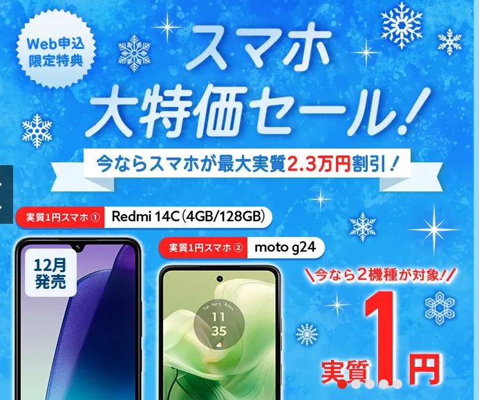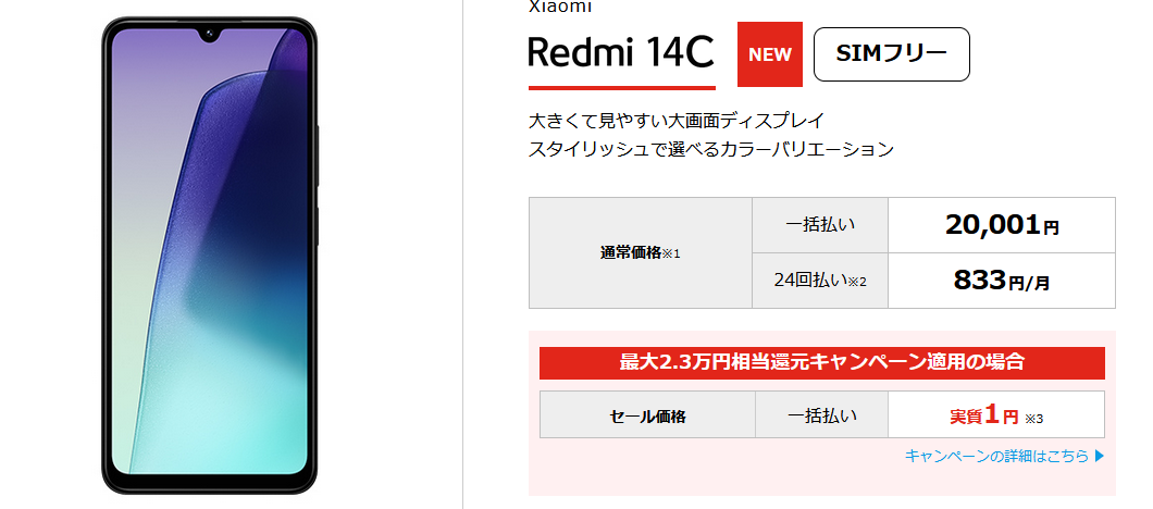 Xiaomi「Redmi 14C」の本体代金が20001円&事務手数料3733円が実費負担でかかりますが、契約後7ヶ月目に23000円分のTLCポイントで貰えるのでそれで実質帳消しという形。