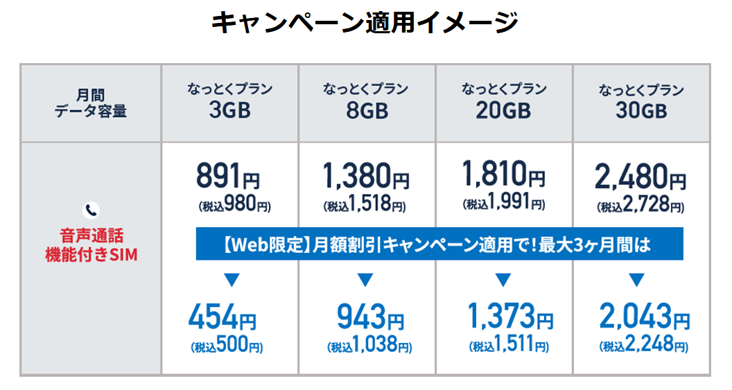 月額割引キャンペーンとの併用も可能で3ヶ月間は3GBプランの料金が500円になります。