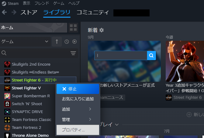 まずはSteamアプリを開いてライブラリ⇨設定を適用したいゲーム右クリック⇨プロパティ