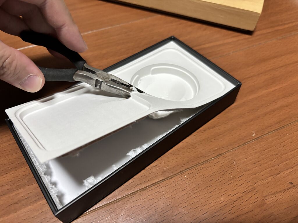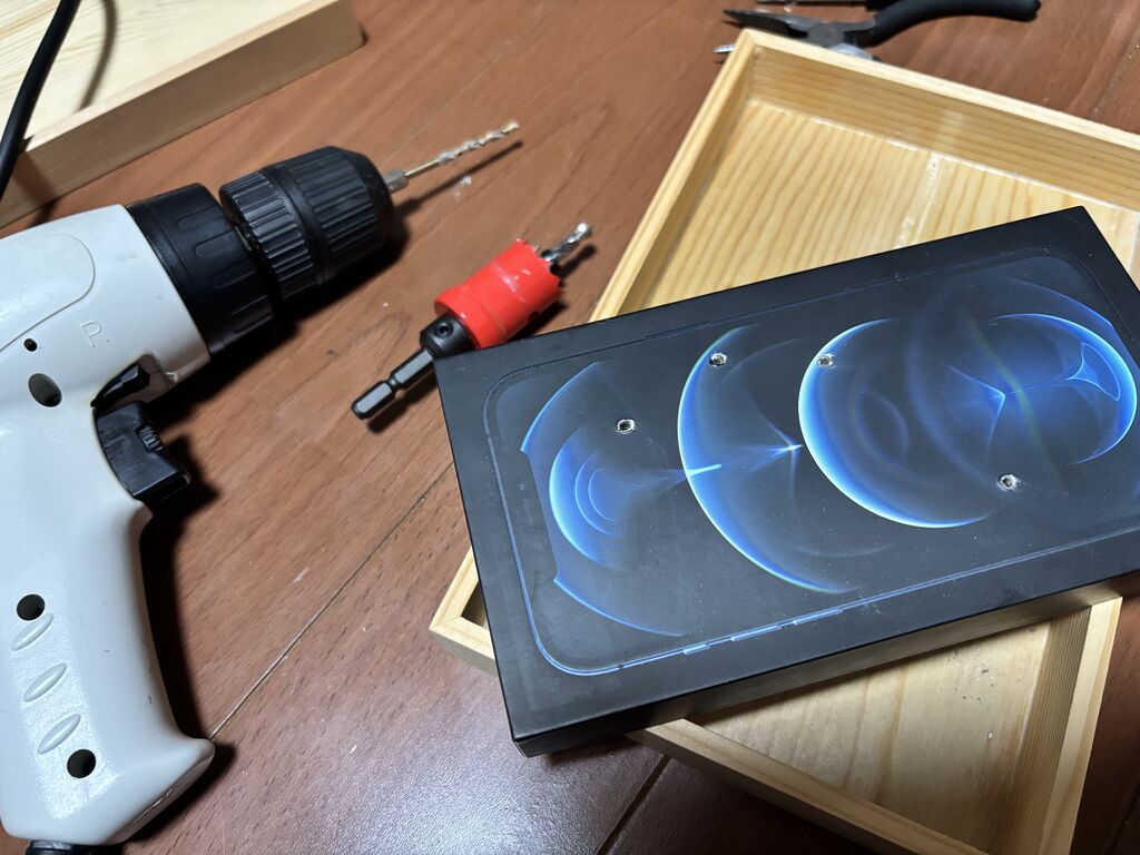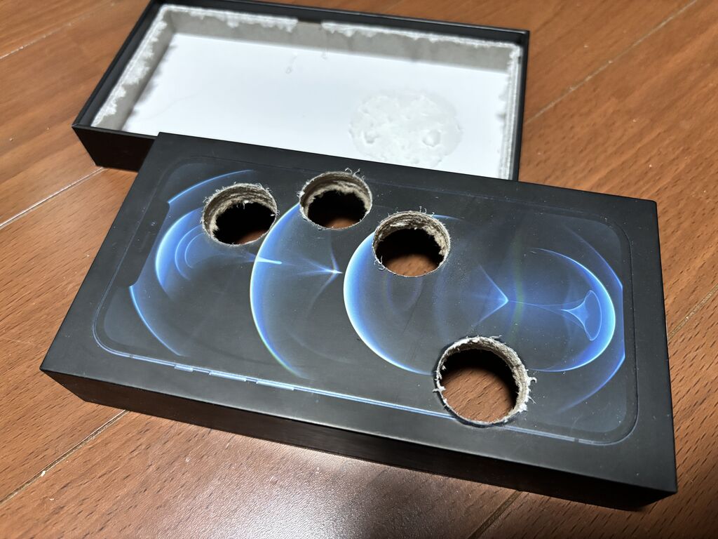 ダイソーで適当な箱を見繕おうかなとも思ったんですがiPhoneの箱が強度もあって加工もしやすいから丁度良いかも~と気づく。