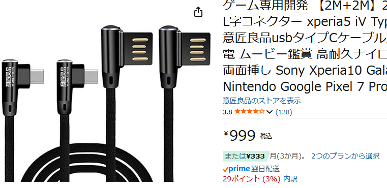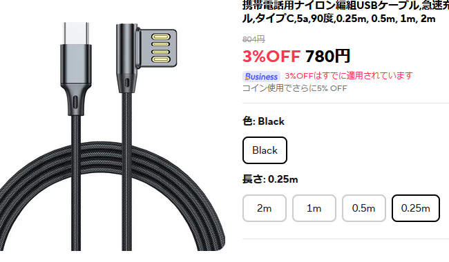 【意匠良品】2本入り USB Type C ケーブル L字コネクター(Amazon)
